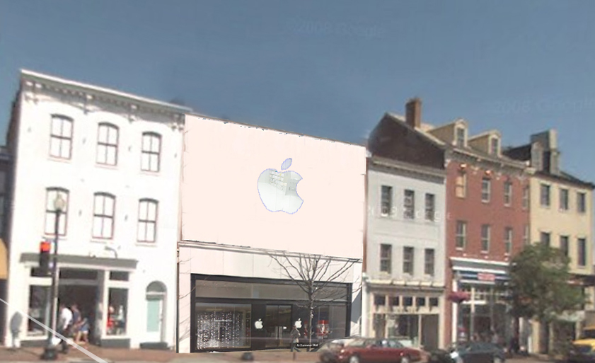 As reported by the indispensable Georgetown Current, and then picked up upon by Washington Paper City Desk and Greater Greater Washington (hell even the Wall Street Journal got in on it) Apple has been having a tough time getting design approval for its proposed store at 1229 Wisconsin (where the French Connection UK used to be). Its most recent proposal was rejected at the December ANC 2E meeting (which GM attended but had to leave before they got around to this). Two days later, the Old Georgetown Board (which carries more even greater weight than the “great weight” of the ANC) also rejected the most recent design.
