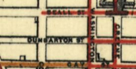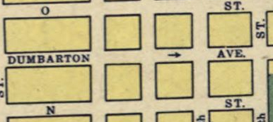 In 1871 Georgetown’s charter was revoked by Congress and the city was absorbed into District of Columbia, thus bringing to an end the autonomy of the City of Georgetown. By 1880, the street names of Georgetown were changed to be consistent with the rest of D.C.’s street grid. Thus east-west streets like Gay and Beall were changed to N and O, respectively; and north-south streets like Congress and High St. were changed to 31st and Wisconsin, respectively. Some streets, though, didn’t fit in with the grid system and so they kept their names. Dunbarton/Dumbarton was one of those.