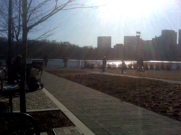 Today’s warm weather has brought life to the new waterfront, offering hope that this long awaited for project will be a popular destination this coming spring. Some fuzzy shots after the jump: