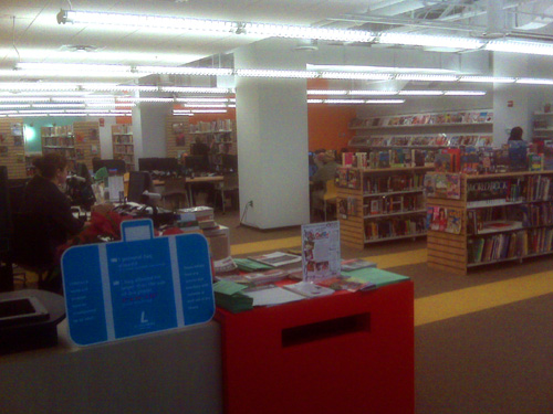 The space is a spacious 4,000 square feet. It is decently stocked with new releases, old standbys, and reference books (World Book 2007!). In addition, it’s got a nice collection of electronic media, including books on cd and popular DVDs like a few complete seasons of the Wire.