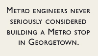 George Mason professor Zachary Schrag tracked down the true story of why there’s no Georgetown stop. In his definitive history of the building of the Metro “The Great Society Subway“, Schrag writes that while there was some opposition to the building of metro stop in Georgetown from the residents, the engineers never seriously considered building