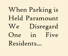of cars in Georgetown. When the ANC or other entities put parking paramount to all other issues, they are disregarding the interests of one in five Georgetown residents. How does the focus on parking affect non-drivers? When we don’t let that basement get turned into a separate apartment because we’re worried about another car hitting the street we’re keeping another set of eyes off the street too. We’re also keeping a customer out of neighborhood stores like Scheele’s. Or a potential babysitter out of our rolodexes. Or just another neighbor to know. All because there’s a sixty-six percent chance they may bring a car.