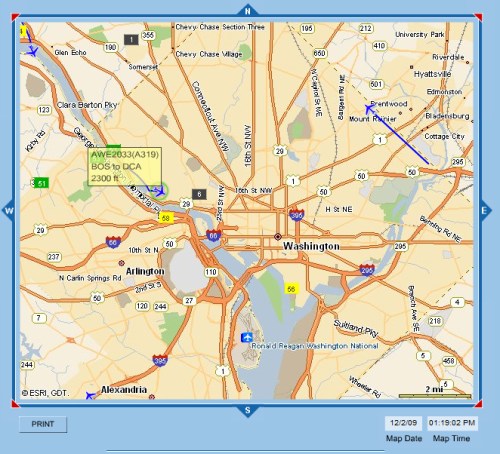 This map indicates that at 1:19 pm on December 2nd, American flight 2033 from Boston (which is an A319 plane) was approaching for a landing at about 2300 feet above Georgetown.