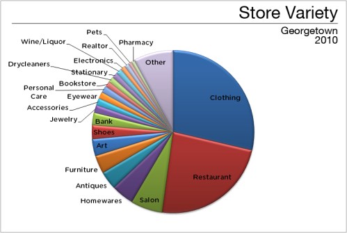 So what is the variety of offerings in Georgetown? As it was last year, Georgetown is still (unsurprisingly) dominated by restaurants and clothing stores: