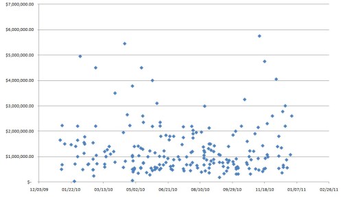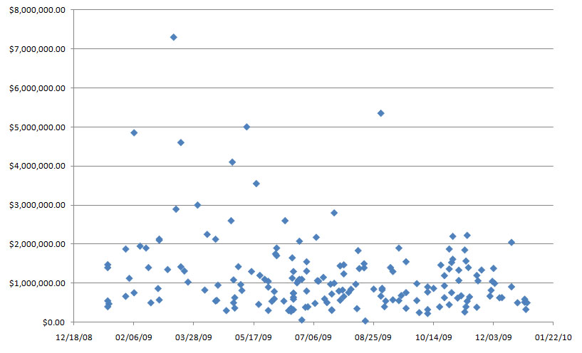 The more pressing question is how did sales prices fare compared with list prices. On that account 2010 was slightly better than 2009. The mean drop in price from list to sale for 2010 was $123,068.86, the median drop was $65,000. That compares with 2009’s numbers of $134,760.13 and $65,000 respectively. So the mean drop is down slightly and the median drop is exactly the same.
