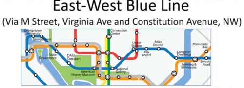 As in earlier plans, the line would head down M St. before taking a right underneath New Jersey Ave. to Union Station and out H St. An alternative plan calls for the line to head down Virginia Ave. through Foggy Bottom and on towards the Mall before it also heads back to Union Station.