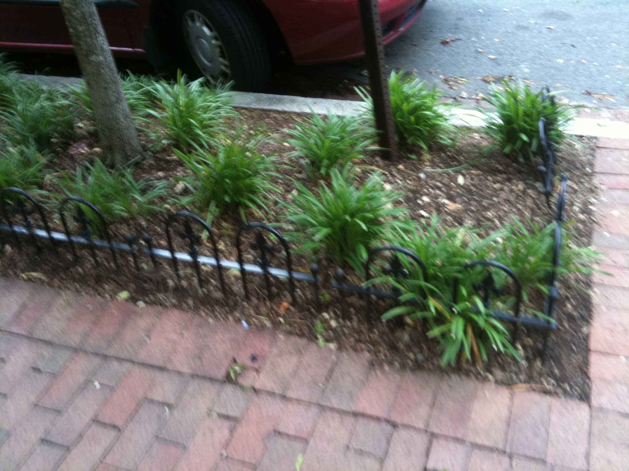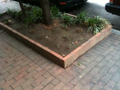 While boxes like the one at the top of this post are pretty, they’re not permissible. The stones are too low and rainwater will just run around the box. Here are a couple other bad fences or borders on the exact same block:
