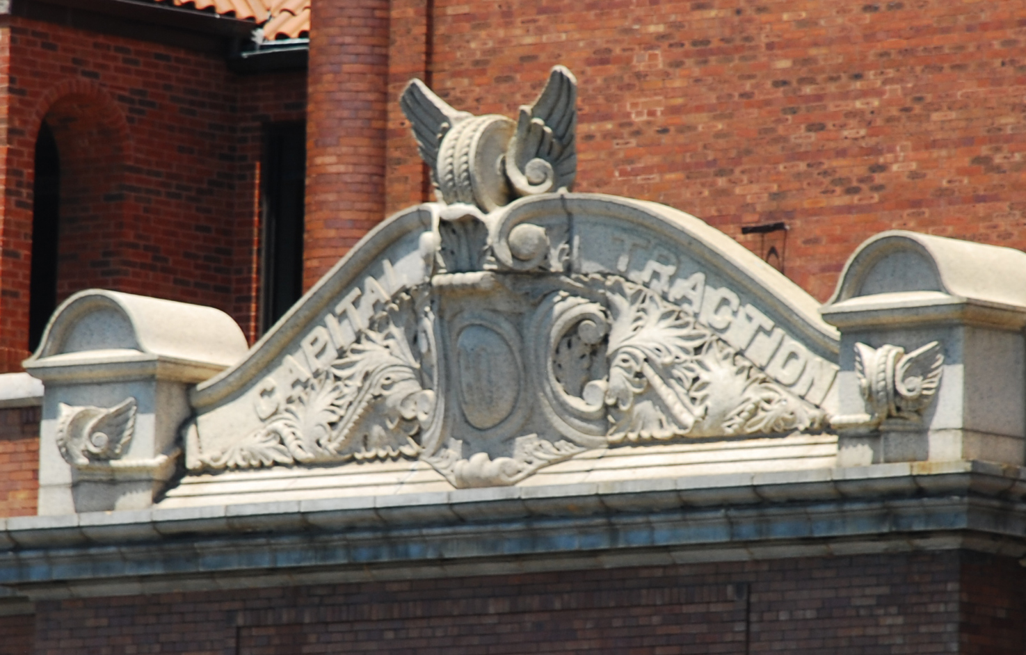 On the pediment of the building it still reads Capital Traction. The Capital Traction Co. was one of the earlier mass transit companies that operated in DC and it constructed the Car Barn with an intent for it to be a Union Station. As described by Wikipedia:
