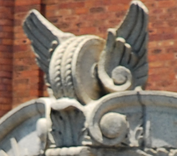 And the old power source for the streetcars is reflected in the pediment. At each side and at the peak, there appears to be a “flying wheel” (somewhat like the Red Wings logo). But if you look close, you can see that they are actually models of the old cable car pulley: