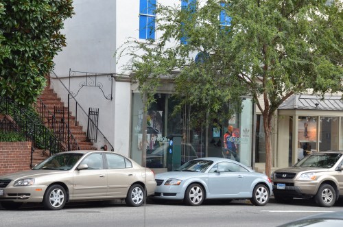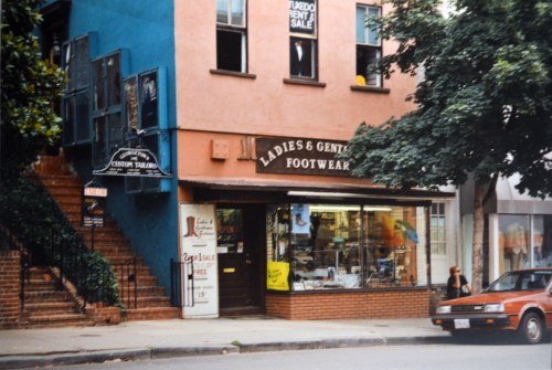 Back in 1993, there appears to have been a tailor up the steps called Georgetown Custom Tailors. The sign frame still remains, but the sign itself is long gone. It looks like the store showed off its wares in small boxes along the stairs. Nowadays those boxes are gone and the upstairs space holds either apartments or private offices.