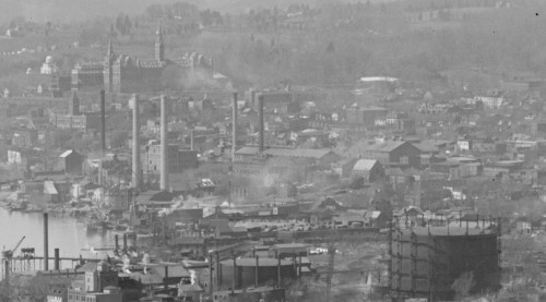 To the right of the Traction Co. chimneys are the two chimneys (one light, one dark-colored) for the long, brick building on the north side of Grace St. (Can’t remember what its original use was.)