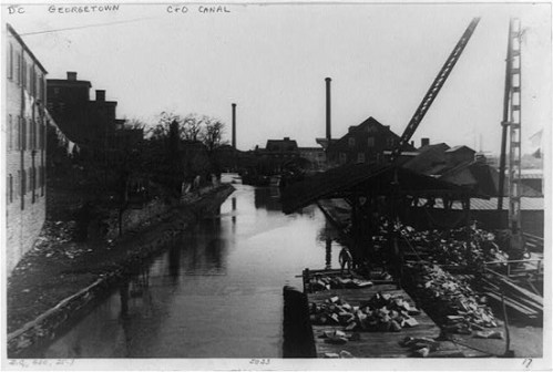 RobRob’s guess seems accurate. The building on the right side of the canal, with its gable end-on to the camera, looks somehow familiar: I have a feeling it may have been part of the Capital Transit shops complex that was later taken over by Army Communications, and was eventually rebuilt as Georgetown Park. This would put it between 34th Street and Wisconsin. An interesting aside: note that there is laundry hanging out to dry from the building on the left.