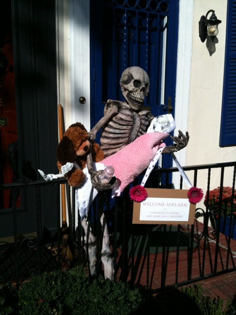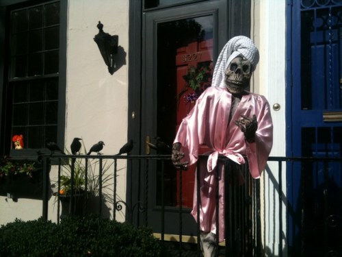 Every year at this time, GM’s neighbors, Marnie and Dennis Kenney, post a skeleton on their stoop (above is a photo from a few years ago). And every day he or she (the skeleton is of indeterminate sex) gets a new, often increasingly creepy, outfit. Last night it was wearing a bridal veil, which is about the creepiest look a skeleton can have.