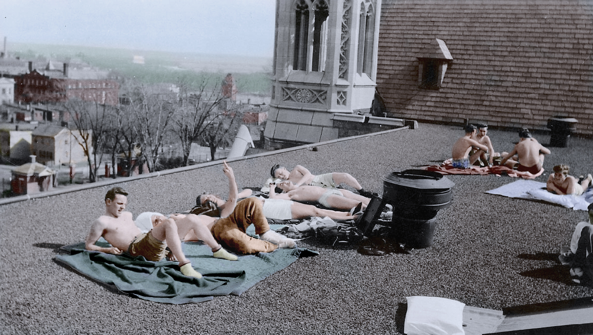 Today in Old Georgetown in Color, GM brings some color to an off-color scene: the sight of a bunch of GU students sunning themselves on the roof of Copley Hall in 1937, with one of the students flipping the bird to the camera. The photo is curtesy of GU Library and came to GM’s attention via Ghosts of DC.