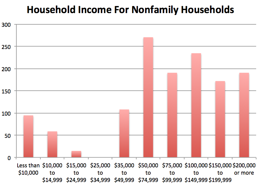 The flipside to this chart is that non-family households (i.e. people living alone or with non-relatives) in Georgetown are much more likely to have more modest incomes: