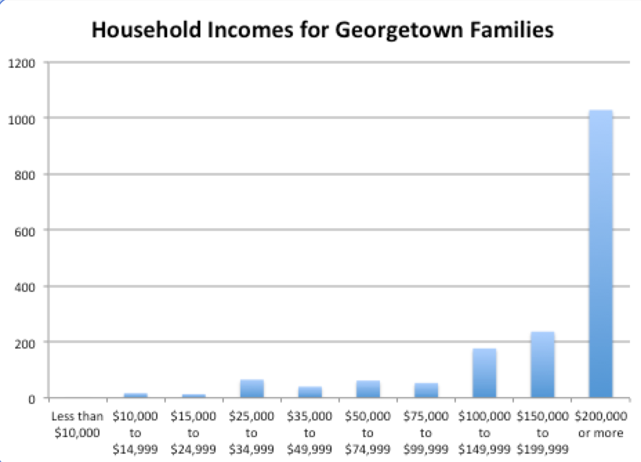 Approximately 82% of Georgetown families have a household income over $100,000, and most of those have incomes exceeding $200,000. This is not surprising, if not a bit depressing.