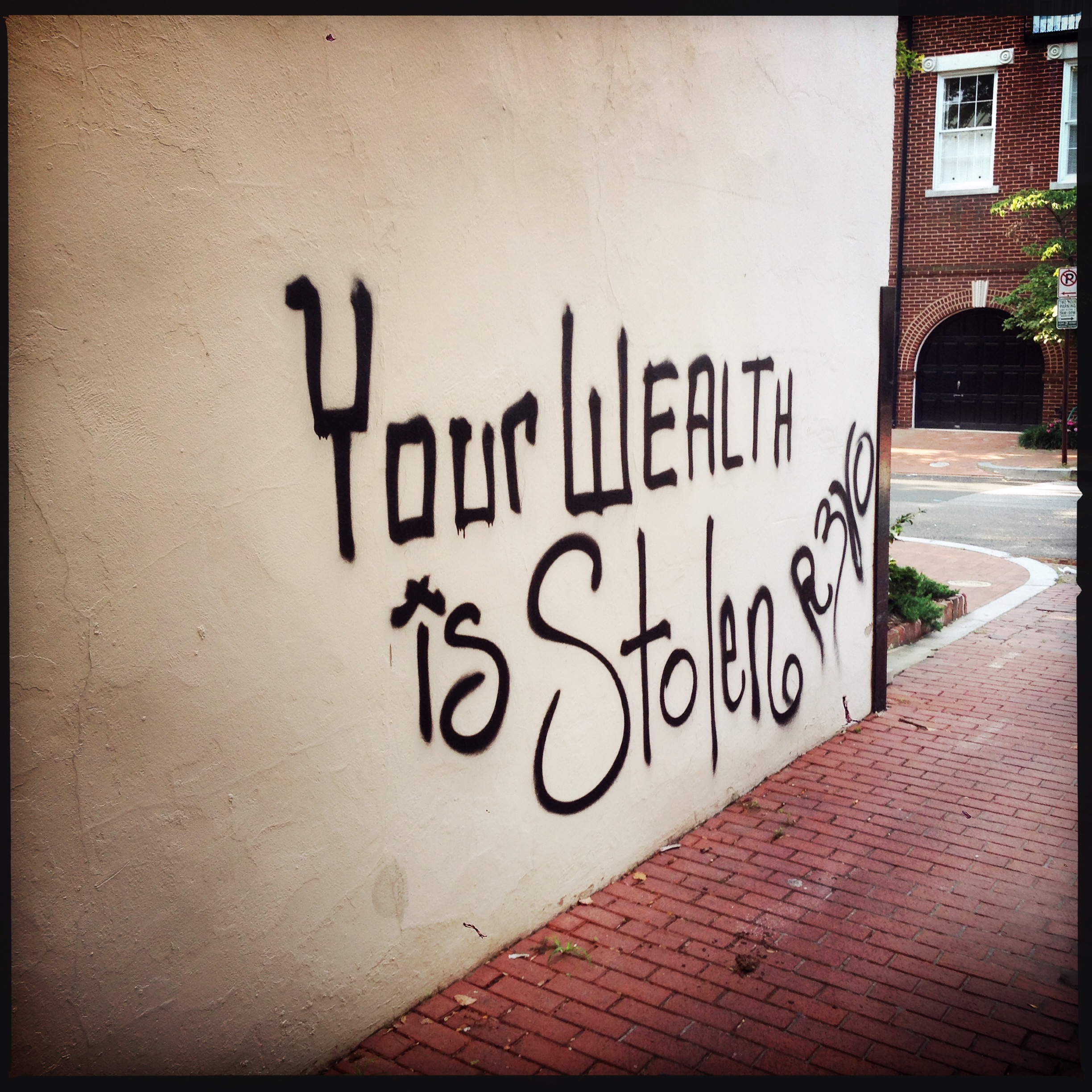 Over the weekend, parts of Georgetown were hit with a particularly political flavored graffiti. Above you see the Opening statement written by the old Marvelous Market parking lot: “This is Class War”. It’s truly an enigmatic missive. Is the demise of Marvelous Market class war? The closed parking lot? The off-white shade of paint on the wall?