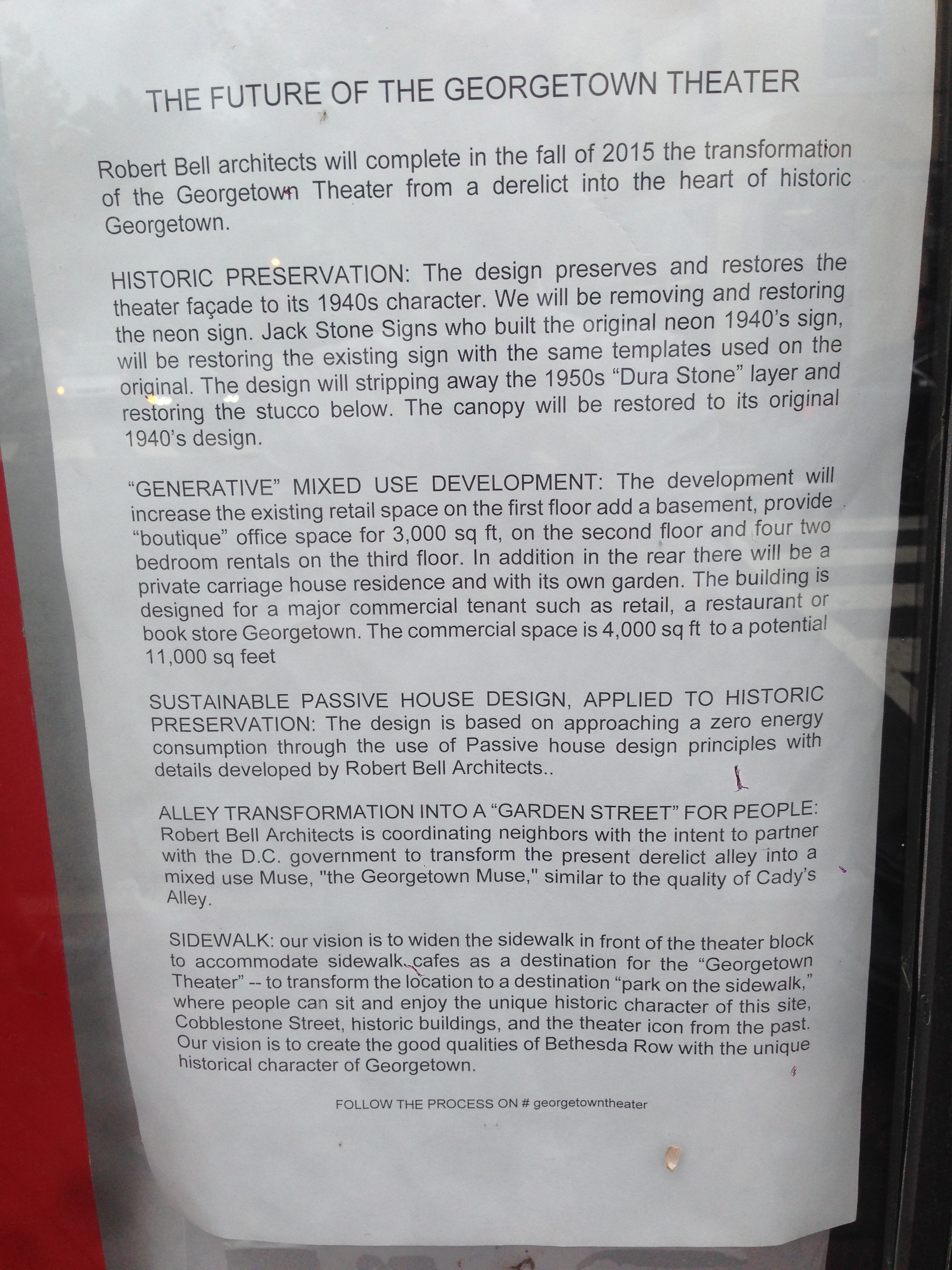 For those unfamiliar, the theater was purchased from the Heon family by Georgetown architect Robert Bell. Bell is about as perfect a custodian for the landmark property that you could imagine. Even years before he bought the building he was spearheading efforts to restore the legendary neon sign. Now that he does own it, his vision for the property and the block around it can come to fruition. What’s that vision? Bell lays it out in a letter posted in the window: