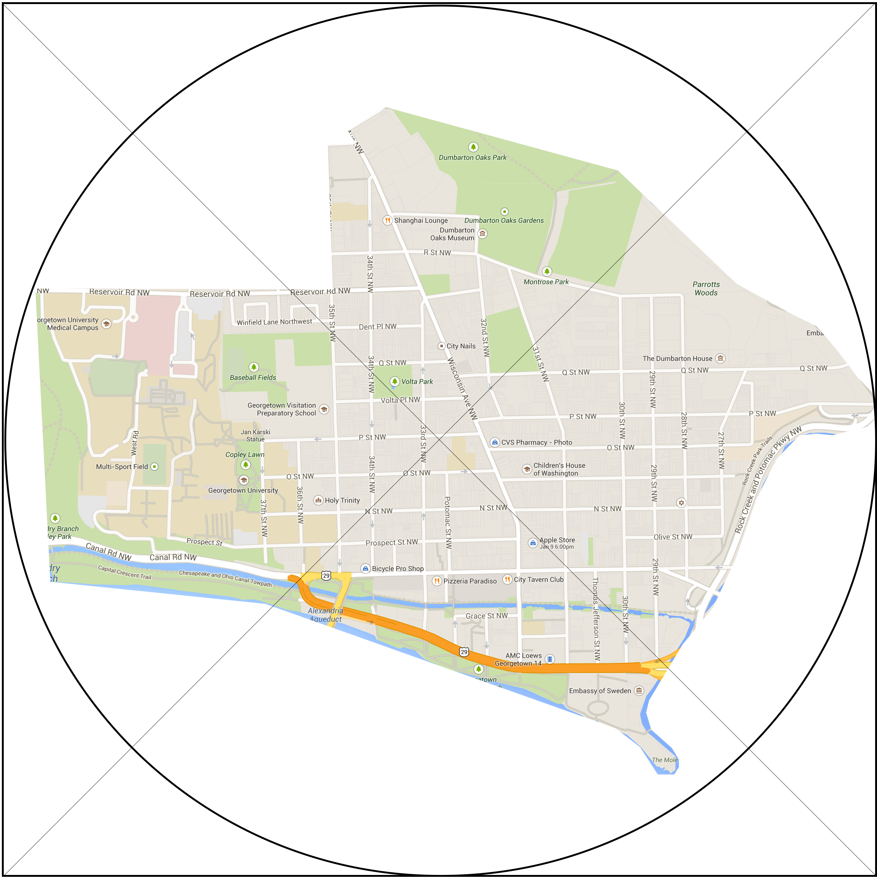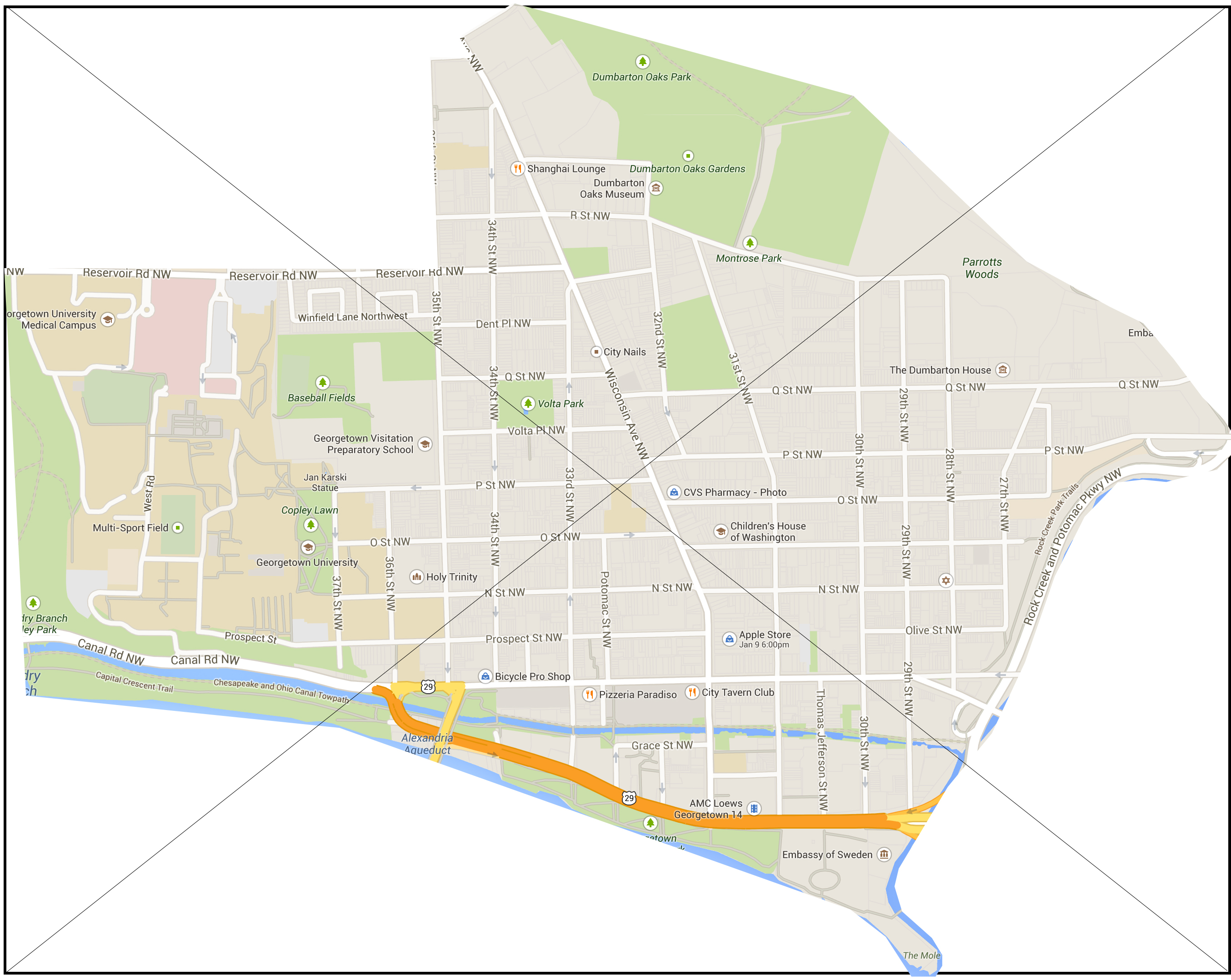 For no particular reason at all, GM was wondering the other day: where is the center of Georgetown? The “spiritual” center may be M and Wisconsin (which is a problem). But where is the actual geographic center?