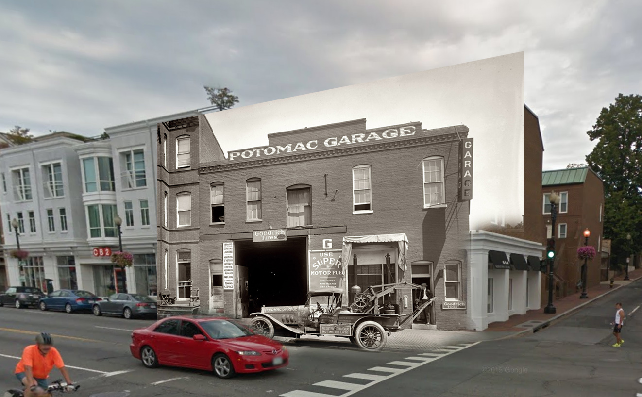 The old photo was taken in 1922. (Go to Shorpy for more info on the photo). It shows the Potomac Garage (3307 – 2209 M St.) According to the sign on the side of the truck, if you wanted them “Just Call West 344”.