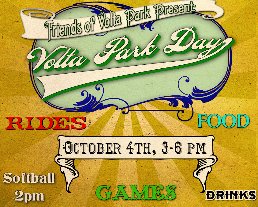 Fall is here, and what better way to celebrate that fact than enjoying some good times with your neighbors while supporting a vital neighborhood resource? Volta Park Day returns October 4th from 3-6 pm. As always, there’ll be rides, games, drinks and plenty of food to enjoy. All proceeds go to Friends of Volta Park which supports the beautification and improvement of Volta Park.