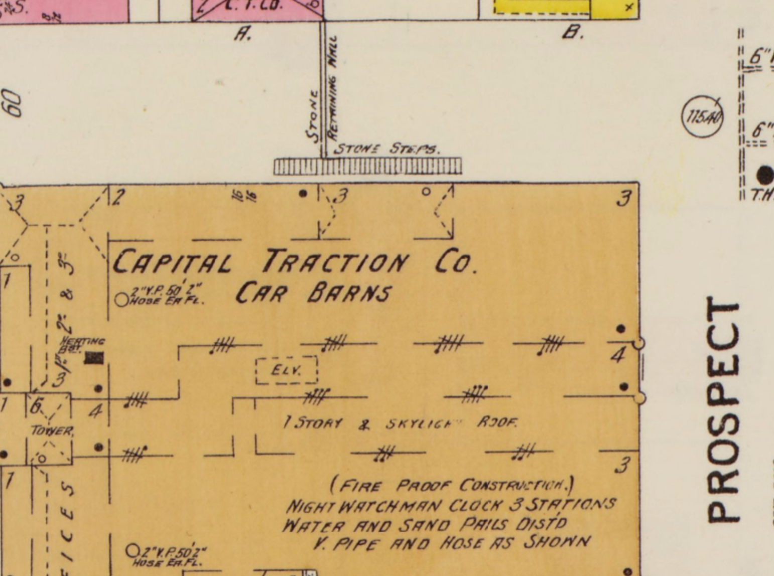 Unsurprisingly the stairs were built in conjunction with the adjacent Car Barn. The Car Barn was built in 1895 by the Capital Traction Company, which was actually running a cable car system at the time (that’s why some of the building’s decorations have flywheels on them). There’s an interesting article in the Washington Post from December 1894 profiling the elderly famous author Mrs. E.D.E.N. Southworth who lived in a cottage perched next door on Prospect. Here it is after she passed away when it became a bit of a tourist trap: