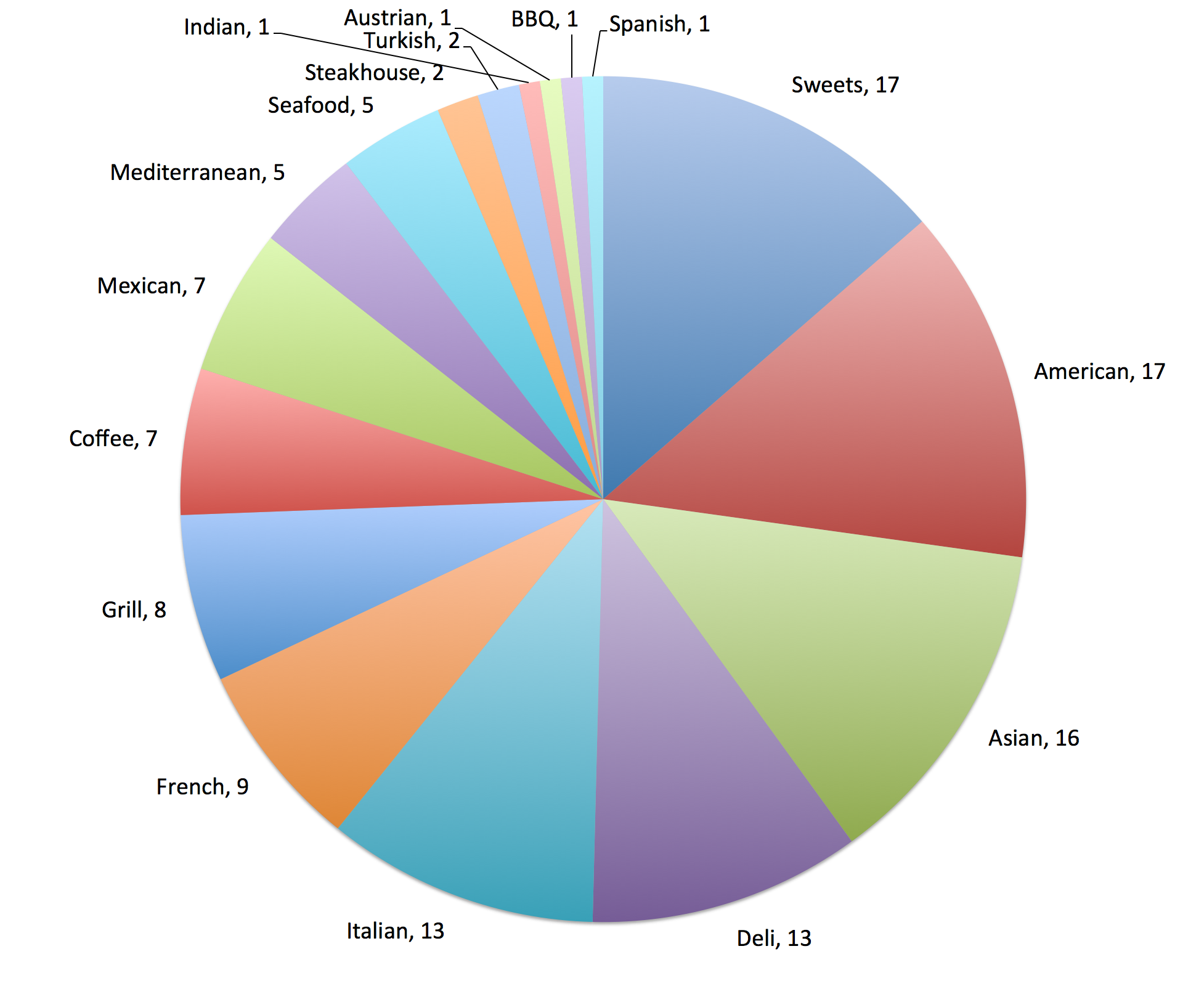 There’s not too much change since last year. Sweets takes the lead this year with 17. American trails now at 17 after losing a net of two last year. GM decided to lump all Asian cuisine into one category so to better represent the prevalence of Chinese, Japanese, Thai and Vietnamese restaurants.