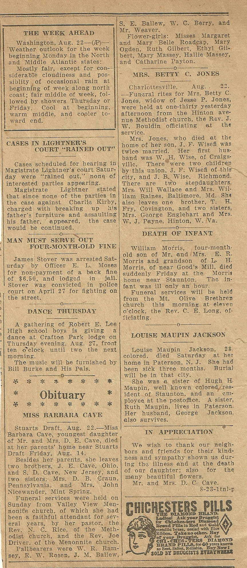 It’s addressed to Miss Barbara Cave in Mount Sydney, Virginia. According to census records, there was a Barbara C. Cave who lived in Mount Sidney, Virginia (which is in Augusta, Virginia, just west of Charlottesville). She was born in 1889 to David and Sophia Cave. Sadly, she died in 1931 at the age of 42: