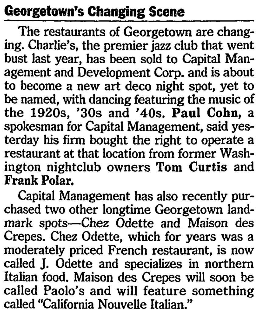 Maison de Crepes was one of the first restaurants in Georgetown and in The City of Washington to have a cappuccino machine. It also had a nice wine list for those 18+over.