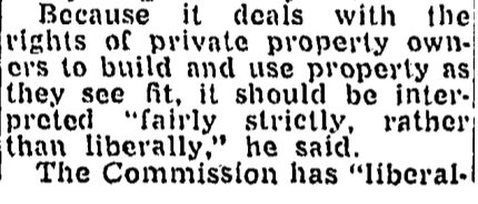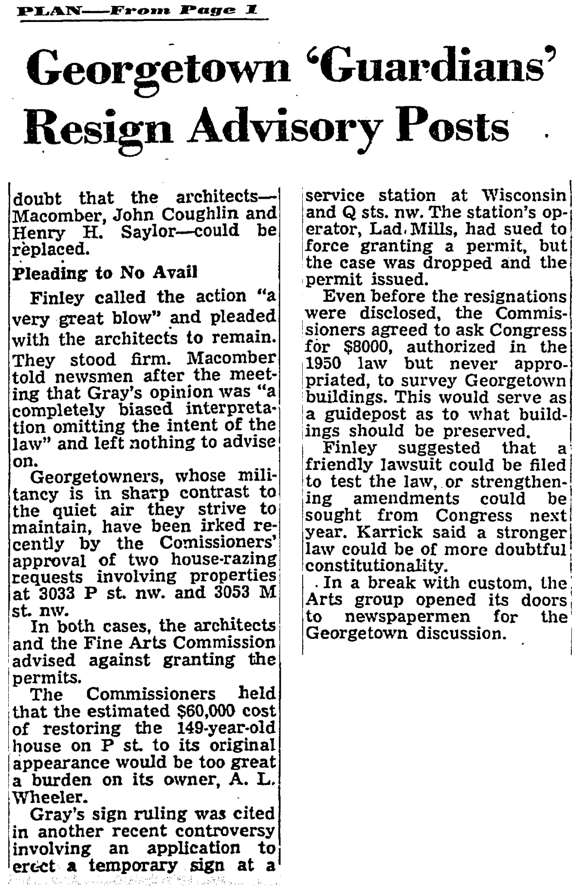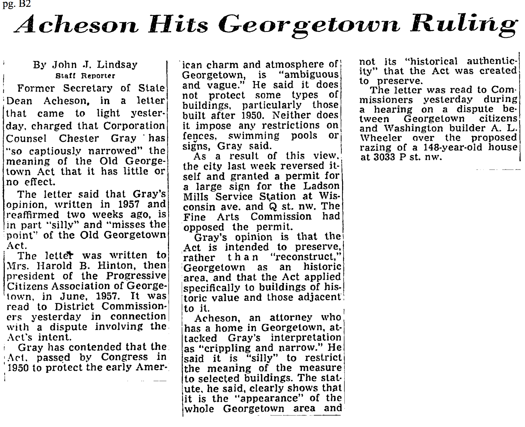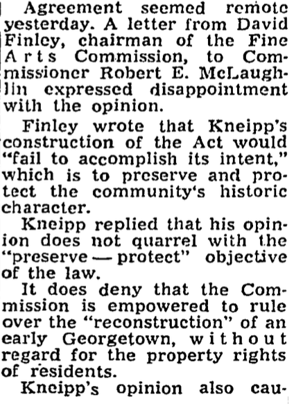 In 1957, an Assistant Corporation Counsel of the District government wrote an opinion that shocked Georgetown, and the greater preservation world. The opinion, written by Robert F. Kniepp and approved by the Corporation Counsel, Chester Gray, concluded that the CFA exceeded the authority granted to it by the act whenever it attempted to weigh in on non-historic structures. As the Post reported June 20, 1957: