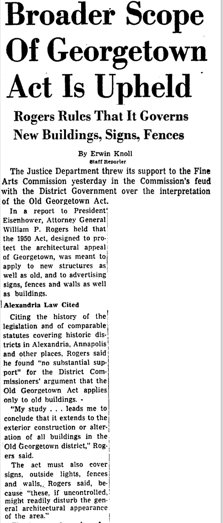 Ultimately salvation for the preservationists came in the form of an opinion issued by President Eisenhower’s Attorney General, William P. Rogers. He concluded in January 1960 that the Corporation Counsel’s opinion was without merit and that the Old Georgetown Act applied to much more than just historic homes existing as of 1950: