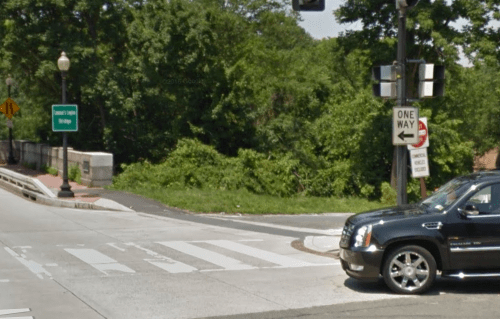 If you’re not familiar with this crossing, it’s the crossing on the north side of P St. immediately east of the P St. Bridge between Georgetown and Dupont. While there is a marked crosswalk and it is right next to a signalized crosswalk, it itself does not have a cross signal. According to the law, drivers must yield to pedestrians.