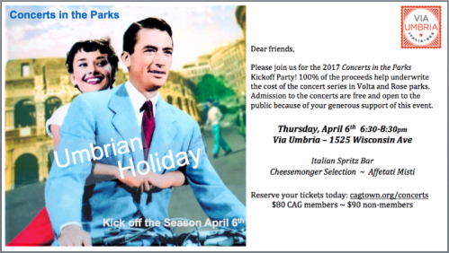 This Thursday, CAG’s Concerts in the Parks committee is holding its annual fundraiser at Via Umbria. The event helps fund the three concert-series, which is always a big hit for the whole community.
