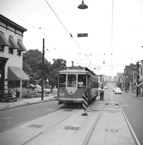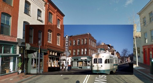 The scene is supposedly 1959, and shows some fantastic relics. Like the last edition, the most obvious site is the PCC streetcar chugging up Wisconsin. If you zoom in the photo, you can see at the far right where the streetcar would switch from getting power from the slot on the ground to overhead wires. Here’s a shot looking south from a block up: