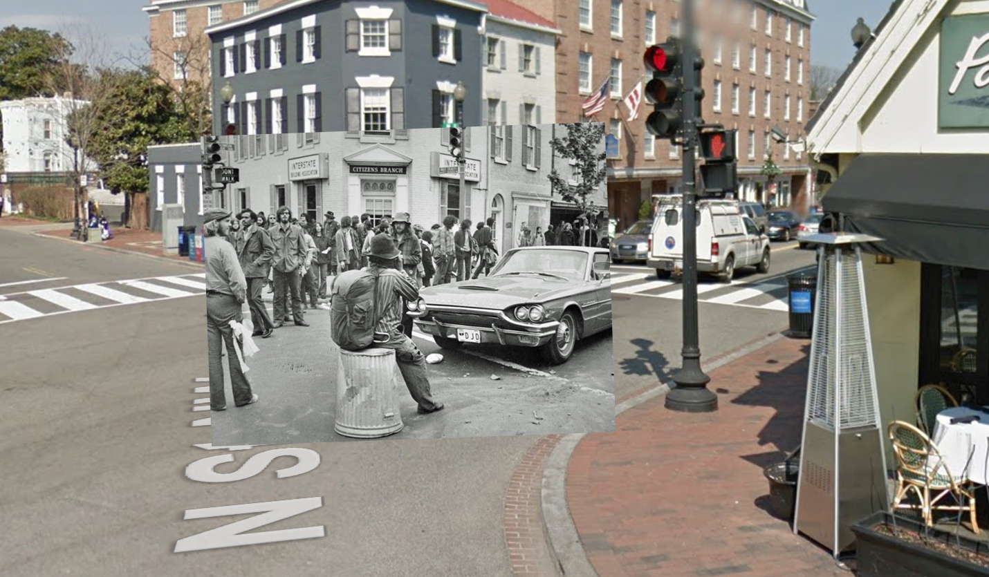 This week for now and a long time ago, GM visits the intersection of N and Wisconsin on May 3, 1971. This was a day of wide-spread anti-war protests around Washington. (A wonderful collection of photos from the protest, from which this photo was drawn, is here).