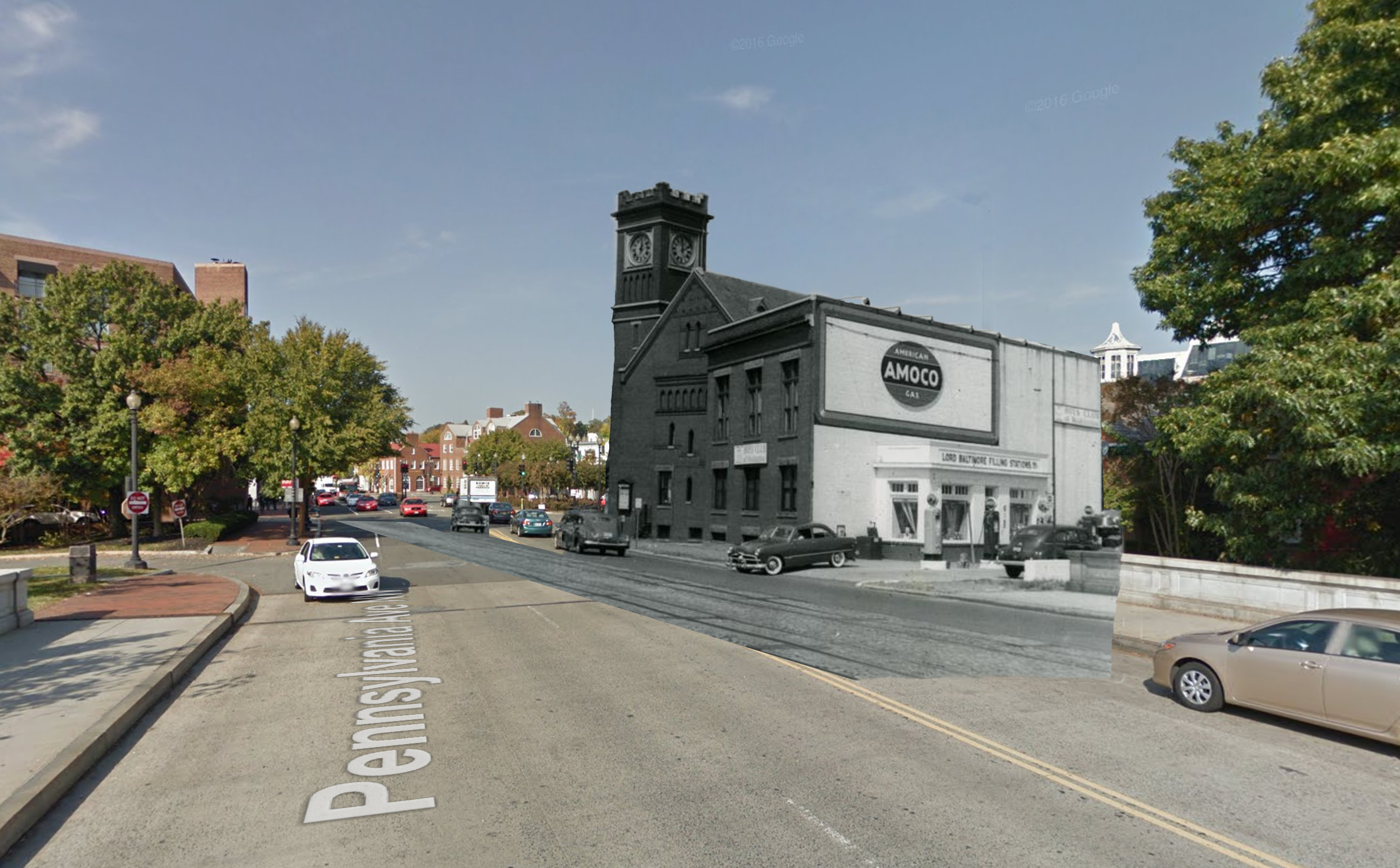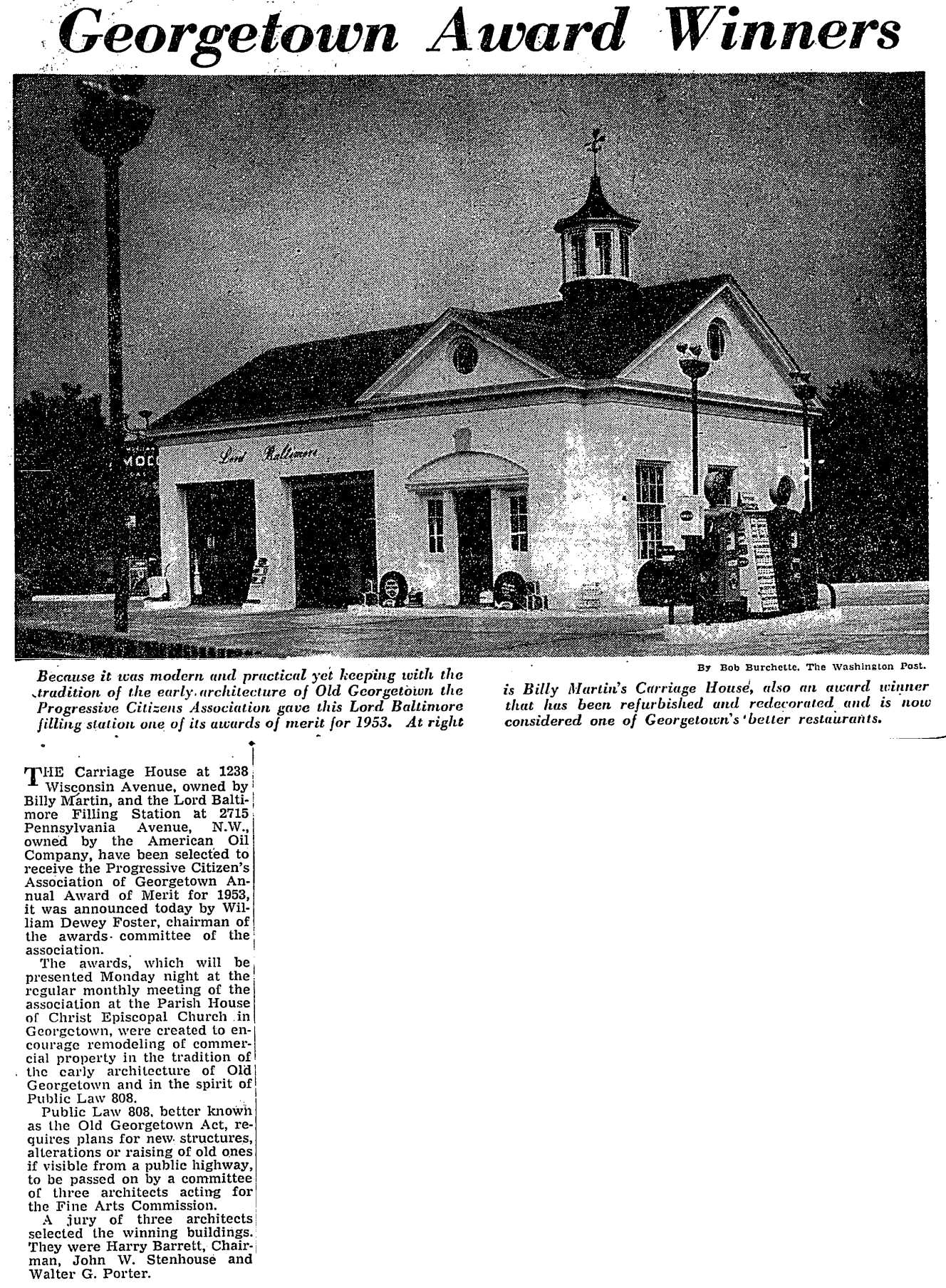 GM wrote that the church was torn down in 1951 and replaced with the gas station that remains there today. What GM didn’t realize was that there was already a gas station on the lot. It was a Lord Baltimore filling station, which was a regional company with many locations. The larger service station that replaced the church a few years later was also a Lord Baltimore station, and was given an award by the Progressive Citizens Association of Georgetown for beautification in 1953: