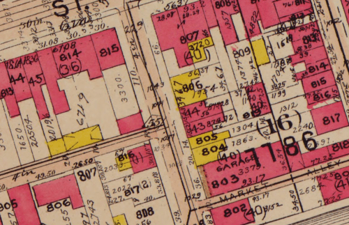 Yellow buildings on this map are wood frame buildings. So the yellow buildings under the 806 are the wood frame buildings in the photo. Given the lack of signs, they appear to be homes. The next two buildings in the picture appear to correlate to the pink buildings in the map (pink means brick or stone).