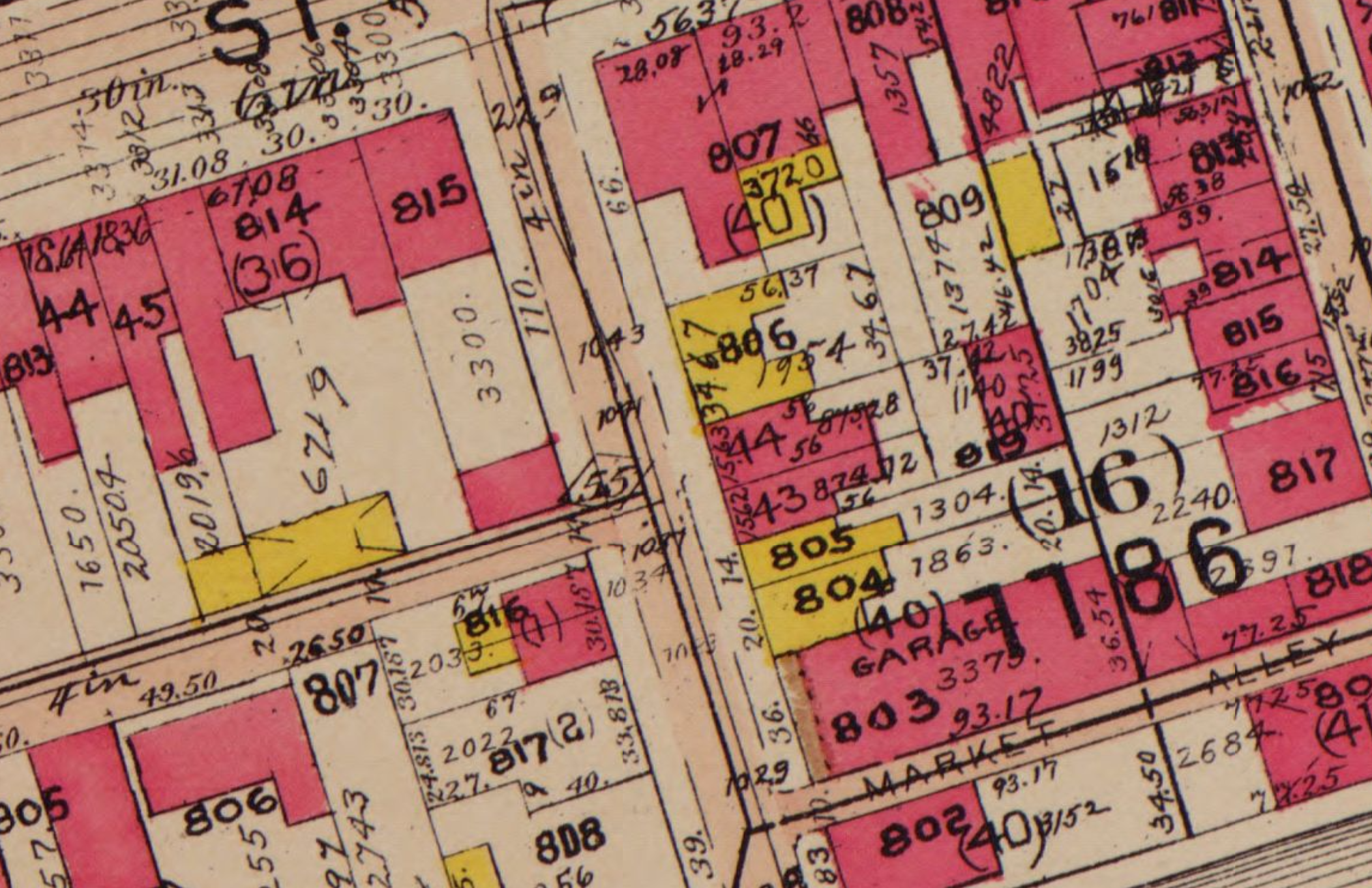 Yellow buildings on this map are wood frame buildings. So the yellow buildings under the 806 are the wood frame buildings in the photo. Given the lack of signs, they appear to be homes. The next two buildings in the picture appear to correlate to the pink buildings in the map (pink means brick or stone).