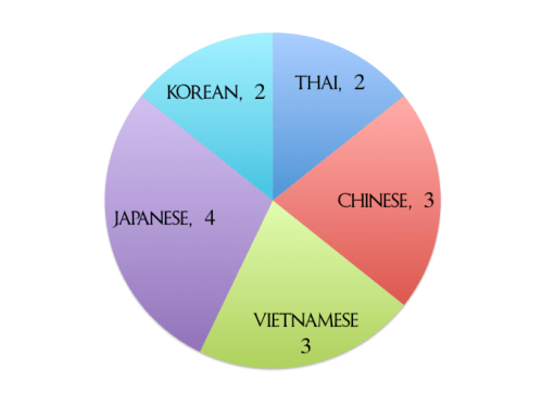 There’s not too much change since last year. Sweets keeps the lead this year with 18 (one more than last year). American still trails at 17. For an overall picture, GM puts all Asian cuisine into one category so to better represent the prevalence of Korean, Chinese, Japanese, Thai and Vietnamese restaurants.