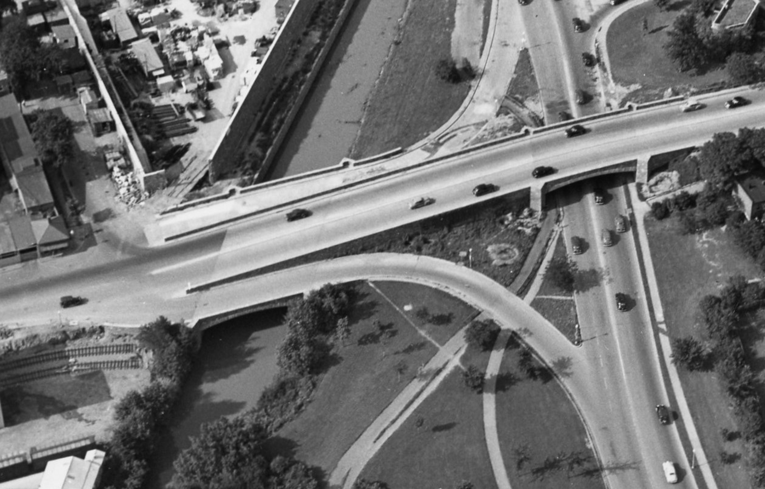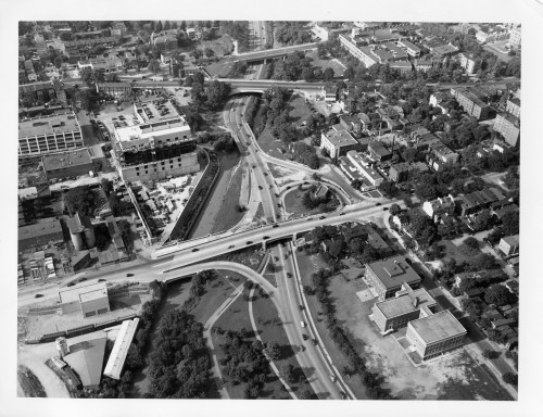Today he starts with an aerial shot of the mixing bowl around lower east Georgetown and the Rock Creek Parkway. The photo is most likely from the late 1940s.