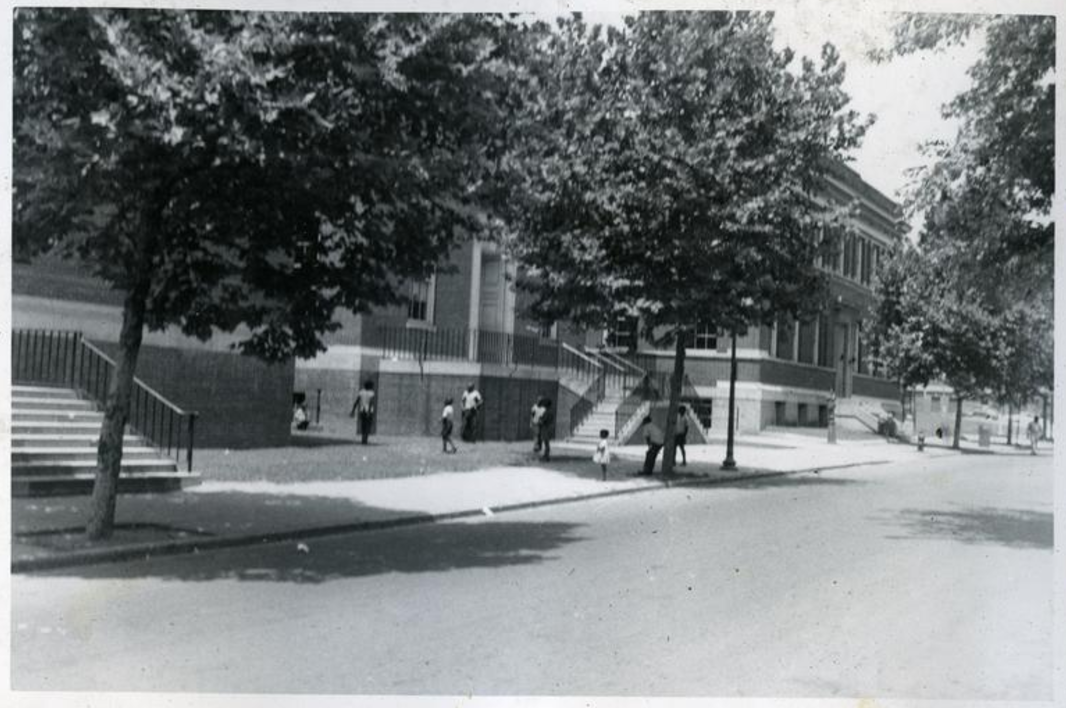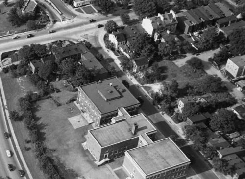You’ll not be surprised to hear that this neighborhood had a high number of African Americans living in it! Highways and their destructive tendrils had an awfully consistent habit of snaking through Black neighborhoods. That large building in the lower picture is the Briggs-Montgomery School, seen in this photo from the Wymer Collection: