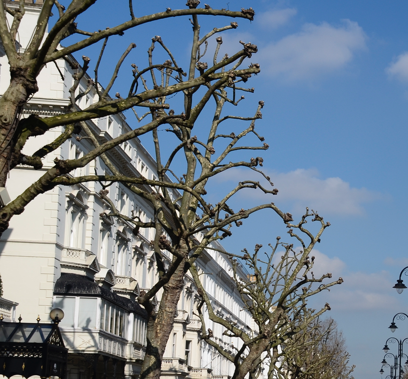 If left along, London planes grow with a distinctly triangular shape. However, a practice known as pollarding can dramatically change that shape. This practice, popular in Europe, involves pruning the trees aggressively to prevent the trees from growing too large. It gives them a spooky look in the winter that makes it look like they’re dead: