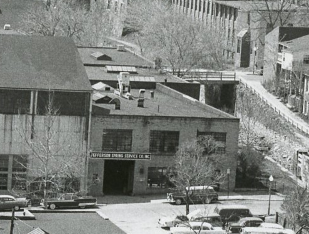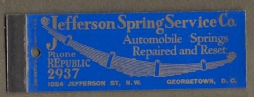The sign says “Jefferson Spring Service Co.”, which was a shop that would service car suspension springs, at least according to this matchbook sold on Ebay: