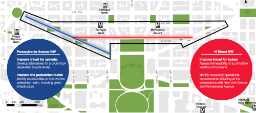 Over the last several years, DC’s transportation department, DDOT, has been conducting the Downtown West Transportation Planning Study. It looked at the area encircle by the black line in the picture above, specifically Pennsylvania Ave. between Washington Circle and the White House, and H St. between Pennsylvania Ave and New York Ave. The staff has produced a final report, and among the recommendations is a call to construct some excellent bike lanes on Pennsylvania Ave.