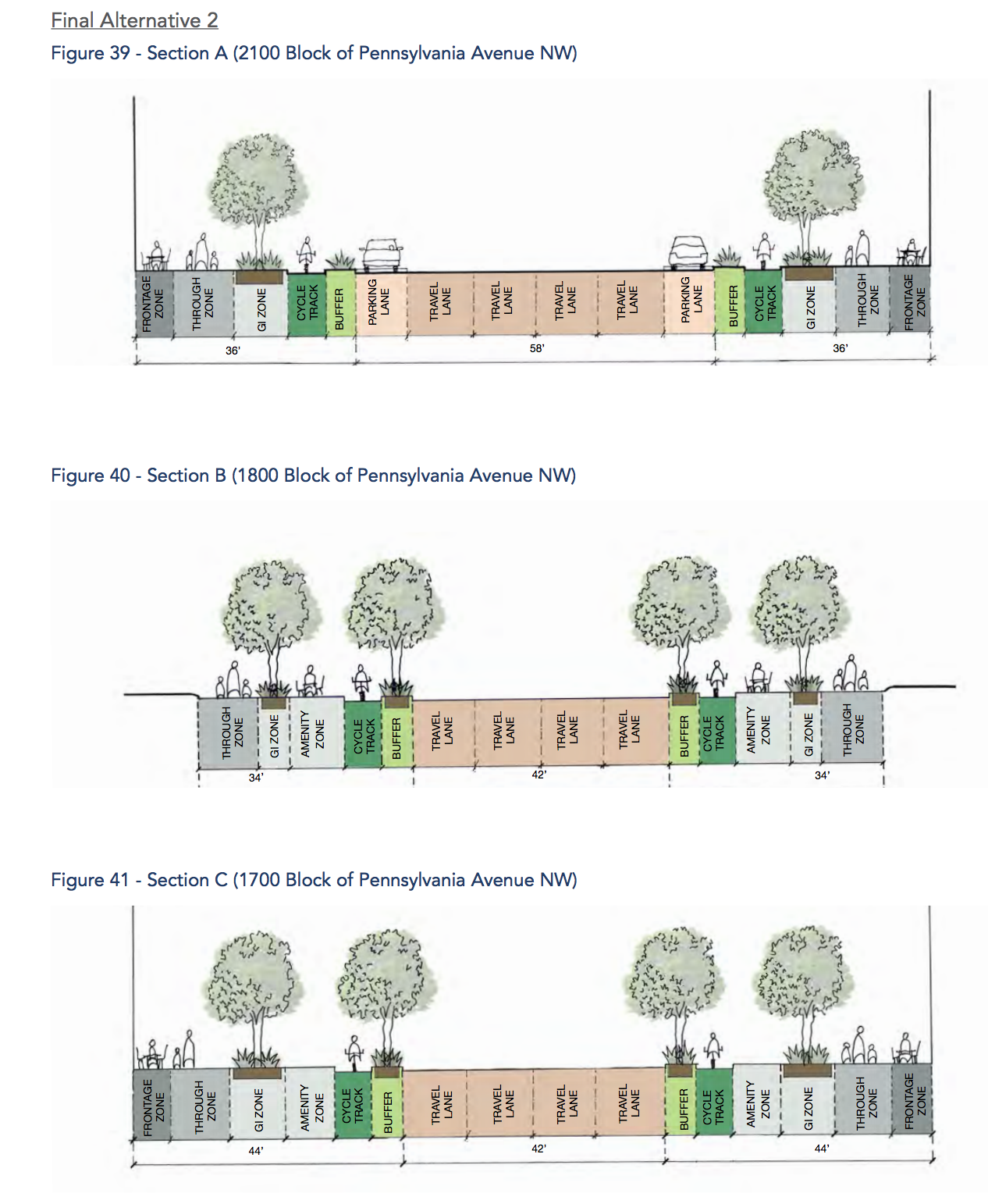 You may be familiar with the bike lanes on Pennsylvania Ave. east of the White House. They were installed under Adrian Fenty. While they were a dramatic improvement at the time, and were installed rapidly, they certainly have their issues. The greatest issue is that drivers often try to drive a u-turn across the bike lanes, which is both illegal and really dangerous. The city has tried different approaches to discourage this behaviour, most recently settling on small rubber curb-like barriers, but it’s still not ideal. The new recommendations would lead to far superior lanes west of the White House.
