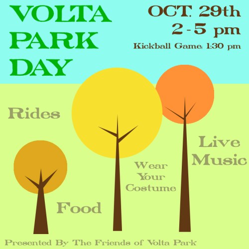 October 29th 2 pm – 5 pm – Volta Park – The Friends of Volta Park will be holding their annual Volta Park Day. East vs. West Kickball game before. Come enjoy rides, games, grilled food and drinks. Welcome in the fall with all your neighbors and help support Volta Park‘s beautification!