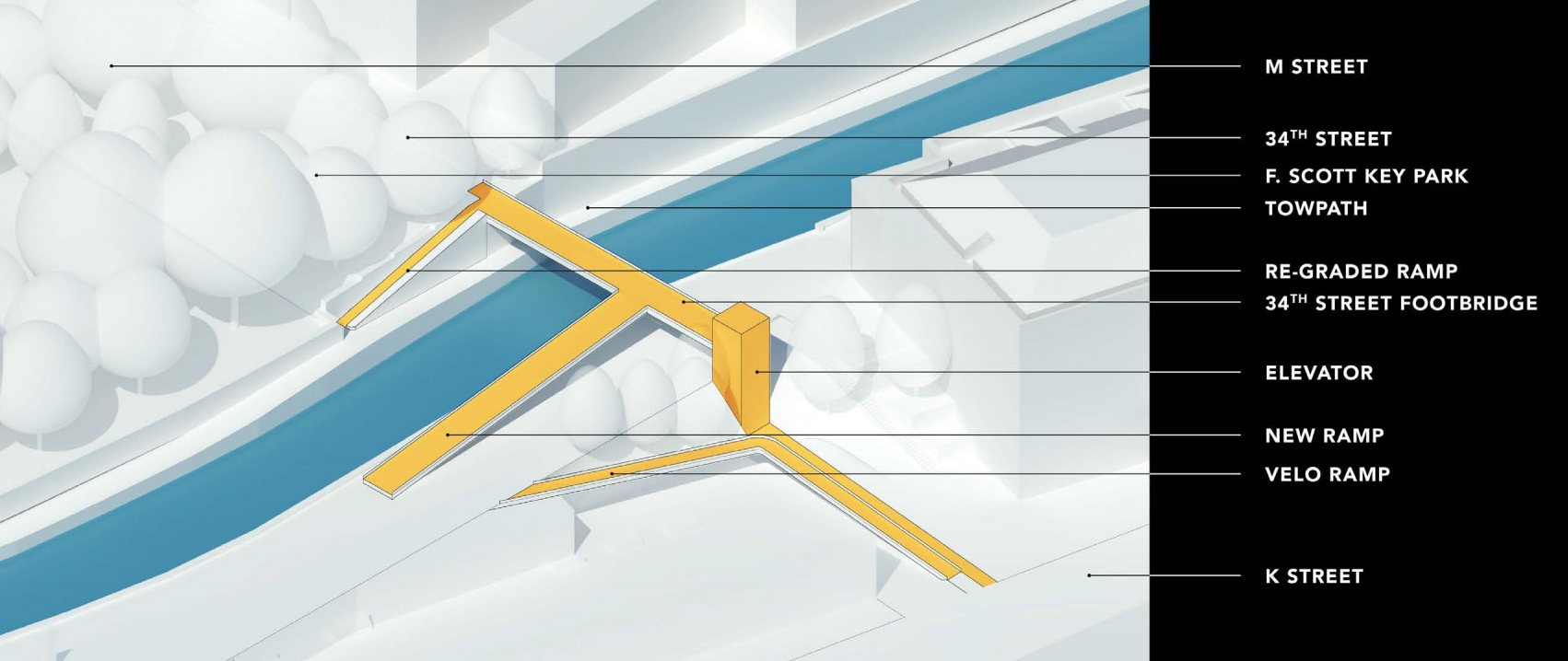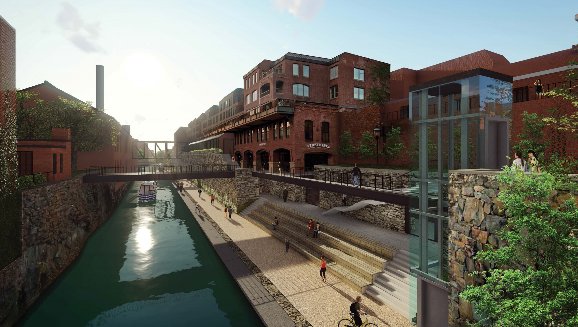 The above rendering depicts a proposed staircase descending from the back of Dean and Deluca down to a catwalk above the towpath. It is unclear what impact this plan would have on the access to the underground parking garage located there.