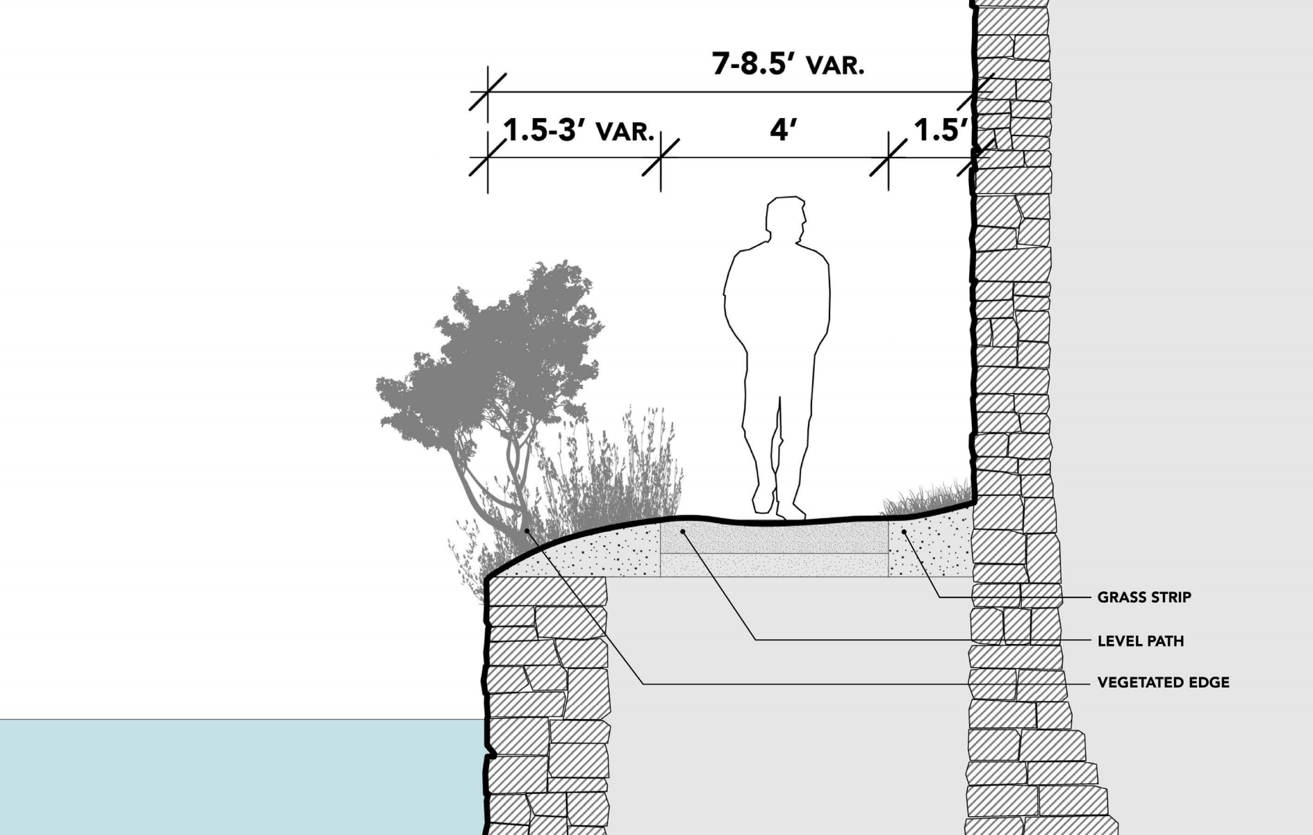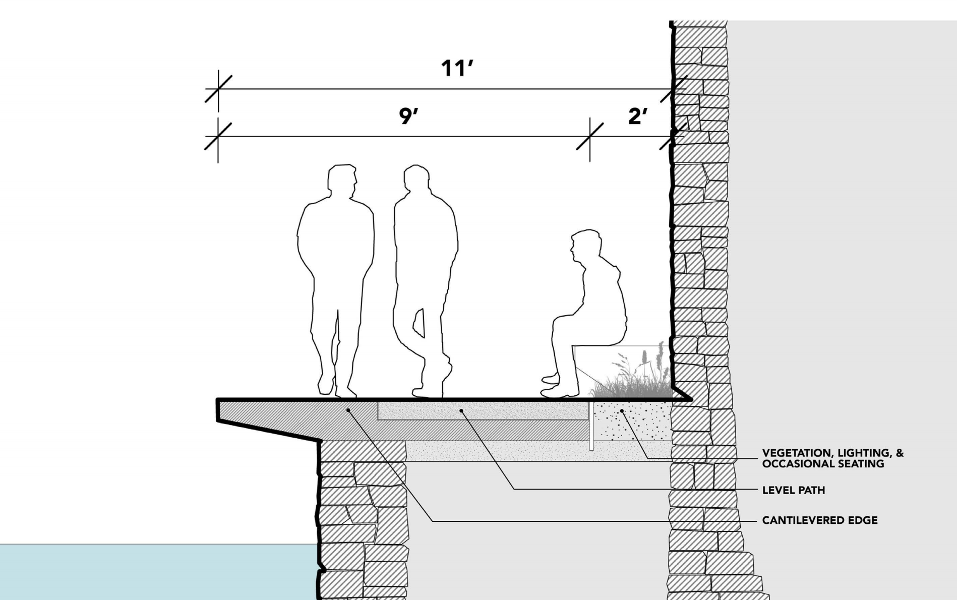 The second option would install a cantilevered edge on the side to give enough room for a 9 foot wide path and maintain vegetation with an occasional bench.