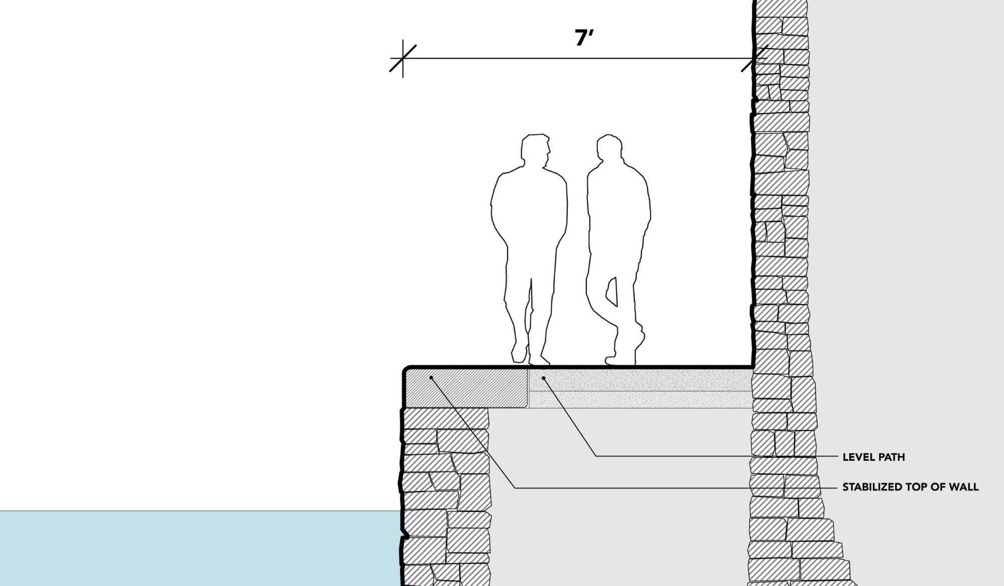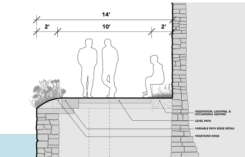 The last option would expand out the wall’s edge to maintain the current look with vegetation along the side. The expanded space would still provide room for a 10 foot wide path and vegetation with the occasional seating on the north side.