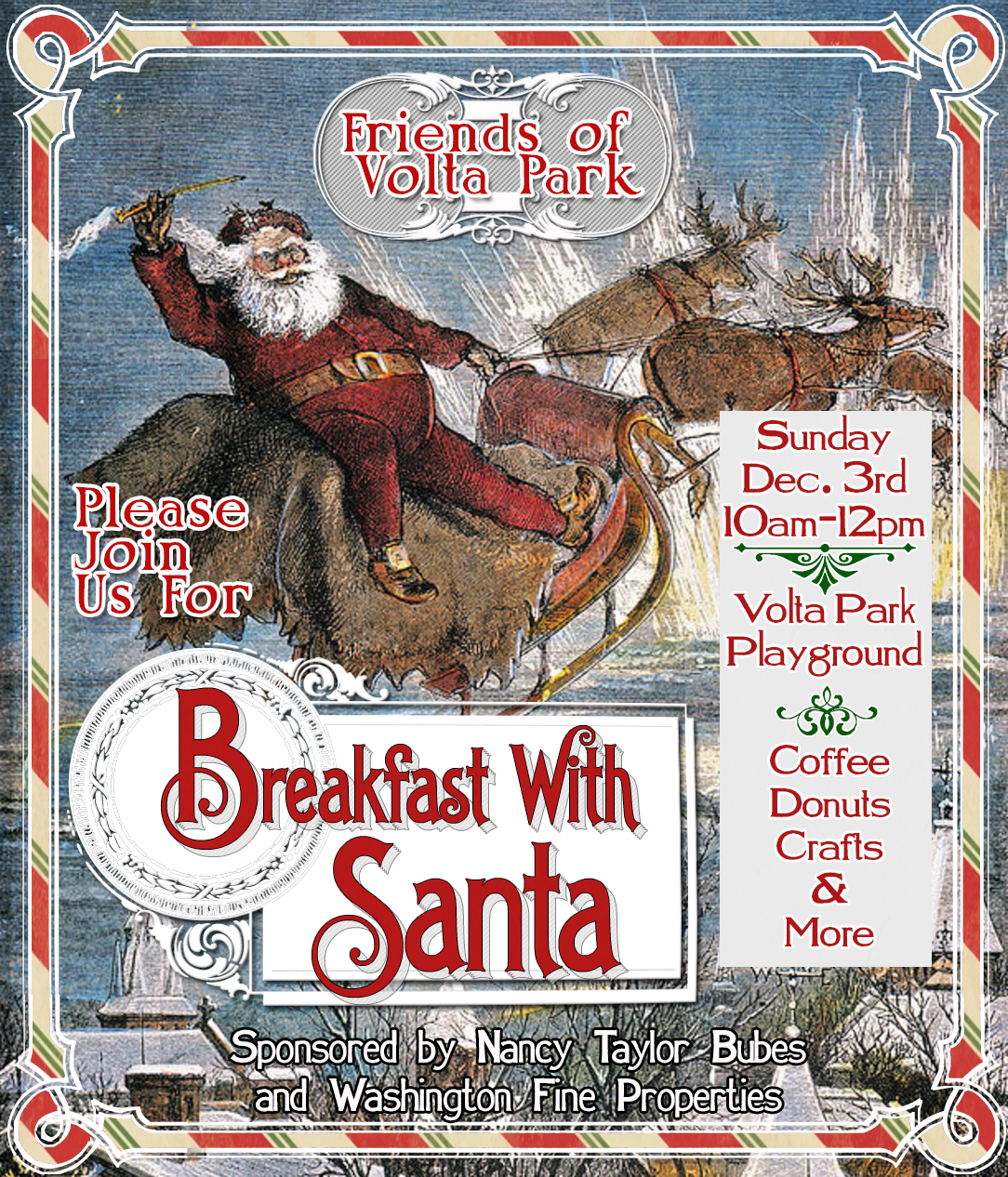 Breakfast with Santa at Volta Park – Please join the Friends of Volta Park as we gather to celebrate the season. Children young and old are invited to take pictures with Santa. Santa will be bringing lots of friends and activities including Christmas carolers, holiday crafts, and Coach John’s soccer school. There will be complimentary coffee, hot chocolate, doughnuts and other baked goods. Santa requests you please arrive early to see magical sleigh ride. Sunday December 3th 10am-noon.